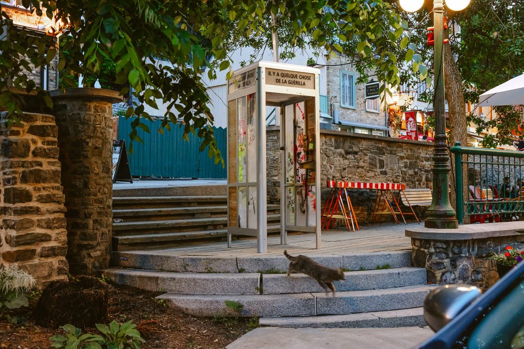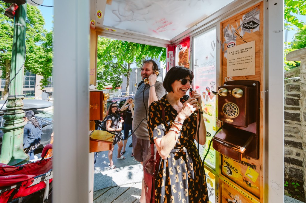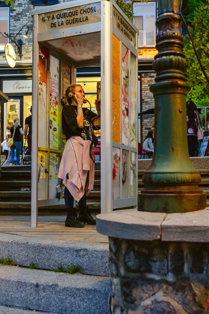 IL Y A QUELQUE CHOSE DE LA GUÉRILLA est la première diffusion du Collectif Bélanger-Sacy rassemblant Gabrielle Bélanger et le slammeur/auteur/performeur Dominique Sacy. L’installation présente une cabine téléphonique mettant à disposition deux combinés vintage permettant aux visiteur.euses d’écouter une conversation poétique entre les deux artistes autour de la rencontre amoureuse à l’ère numérique. L’oeuvre en art public, diffusée par Ex Muro dans le cadre des Passages Insolites 2022, devient un véritable espace de dialogue, les passant.es intervenant librement dans la cabine pendant plusieurs mois.