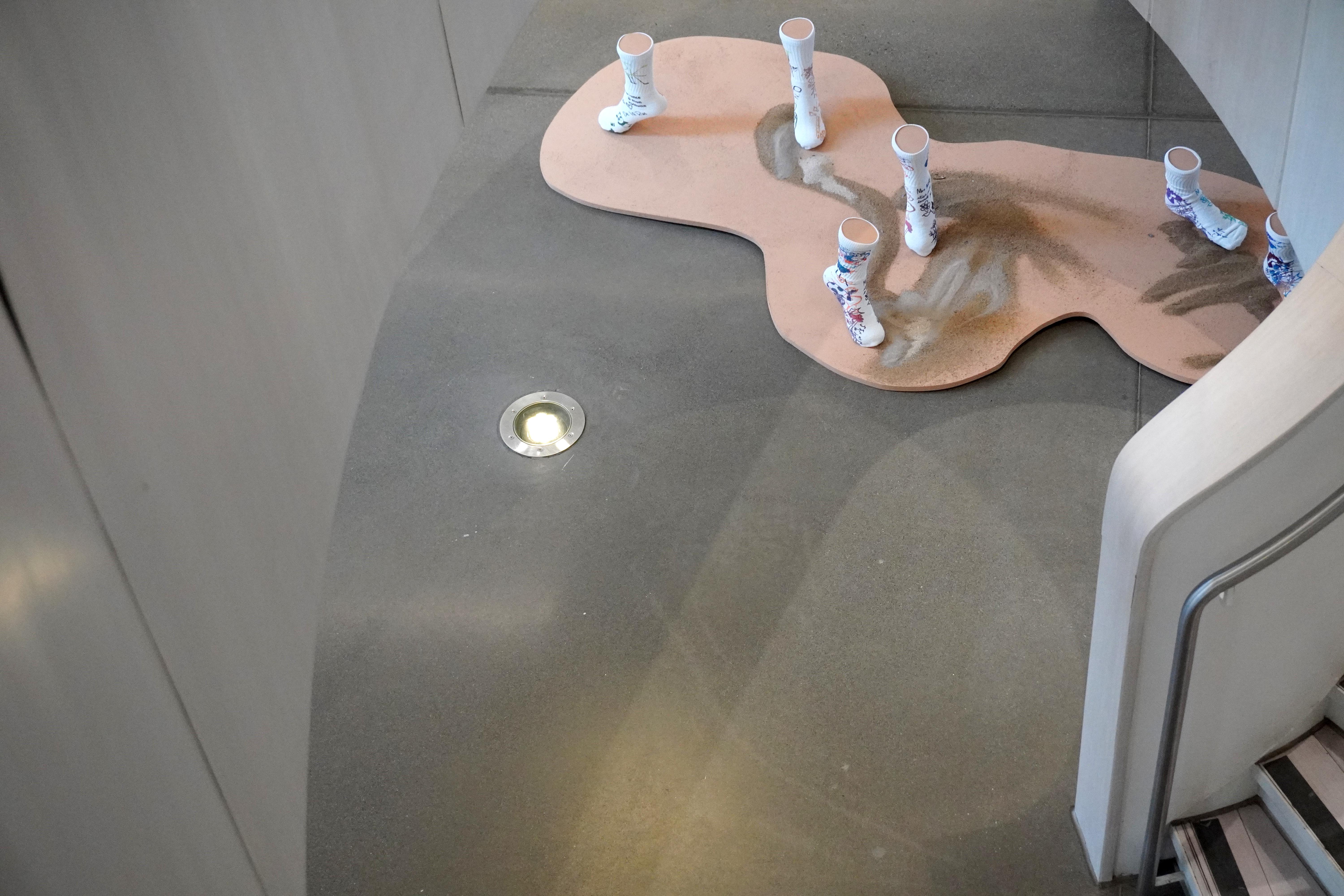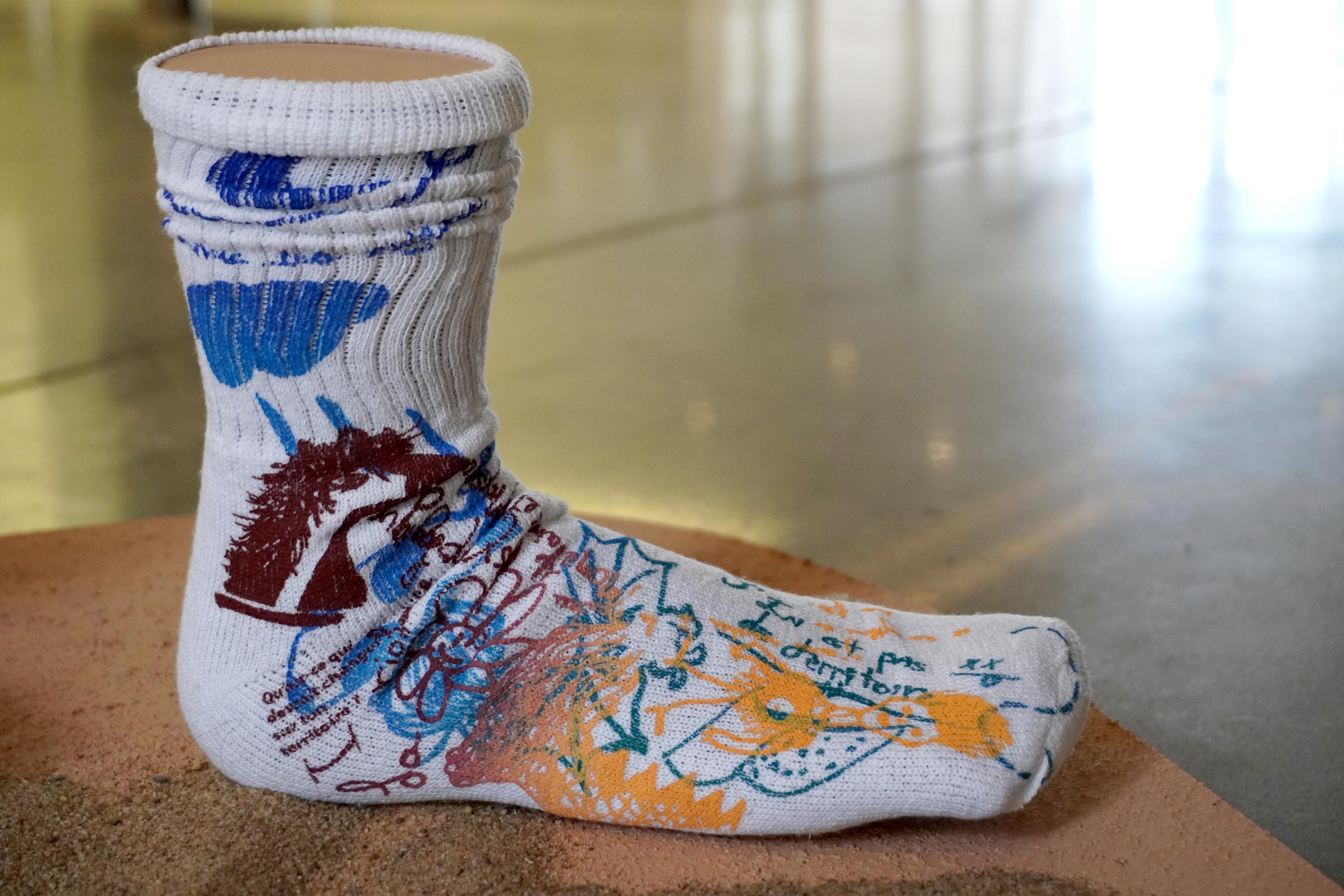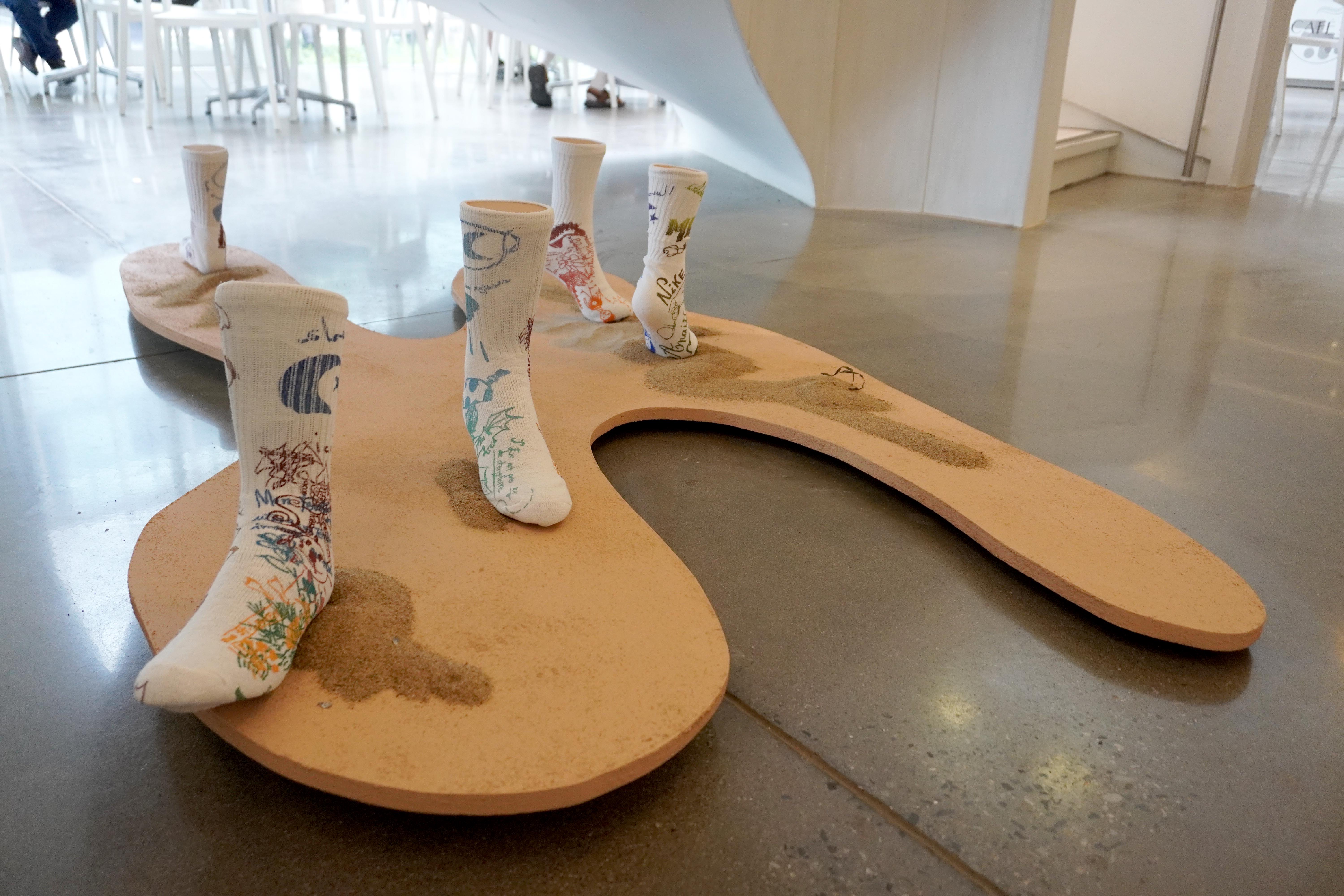 Pour l’exposition, je propose une installation qui met en lumière les estampes sur chaussettes dans un contexte qui rappelle le sable chaud et réconfortant de l’été. L’exposition a lieu à la Bibliothèque publique de Drummondville à l’été 2024.