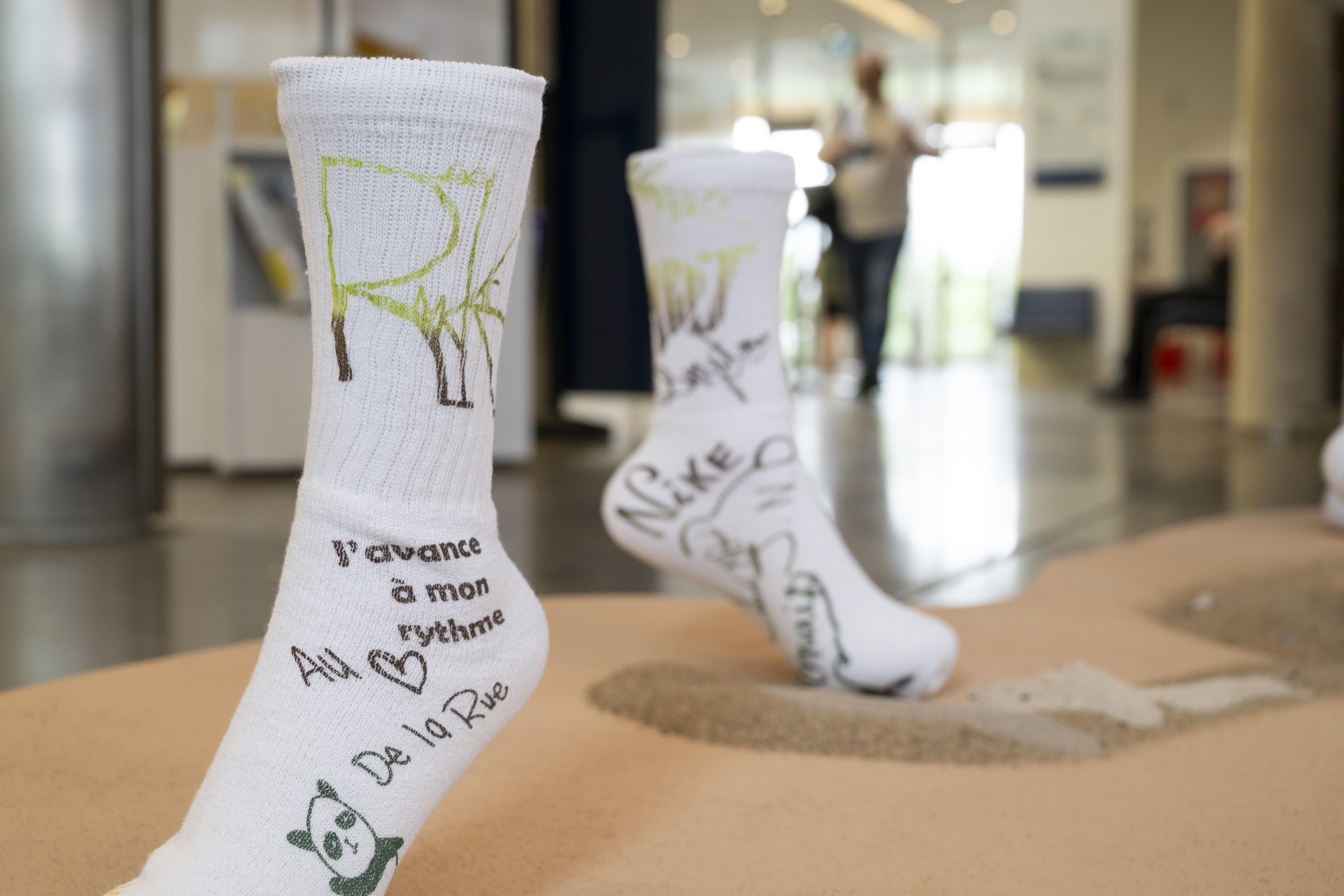 « Qu’est-ce qui te pousse à avancer ? Sur quoi voudrais-tu marcher ? Qu’aimerais-tu changer sur ton territoire ? » sont quelques-unes des questions lancées pour ouvrir la discussion avec les participantes et participants. Les textes et dessins issus des rencontres deviennent des motifs qui sont ensuite imprimés en sérigraphie sur des chaussettes par les participantes et participants avec La Carriole. Chacun.e repart ensuite avec sa paire de bas.