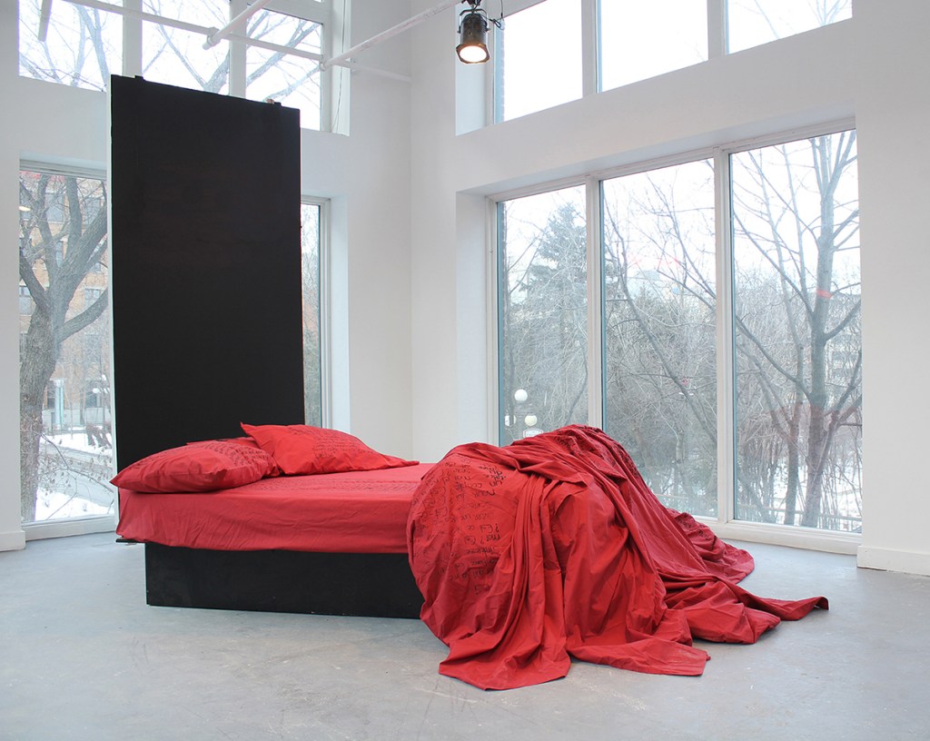 Comme un livre ouvert est une installation constituée d’un lit présentant des draps qui recueillent les propos de femmes travailleuses du sexe et ex-travailleuses du sexe autour de la tension entre sexualité intime et travail du sexe. Chaque femme laisse sa trace dans le lit via le contour de sa silhouette, son texte, sa calligraphie.