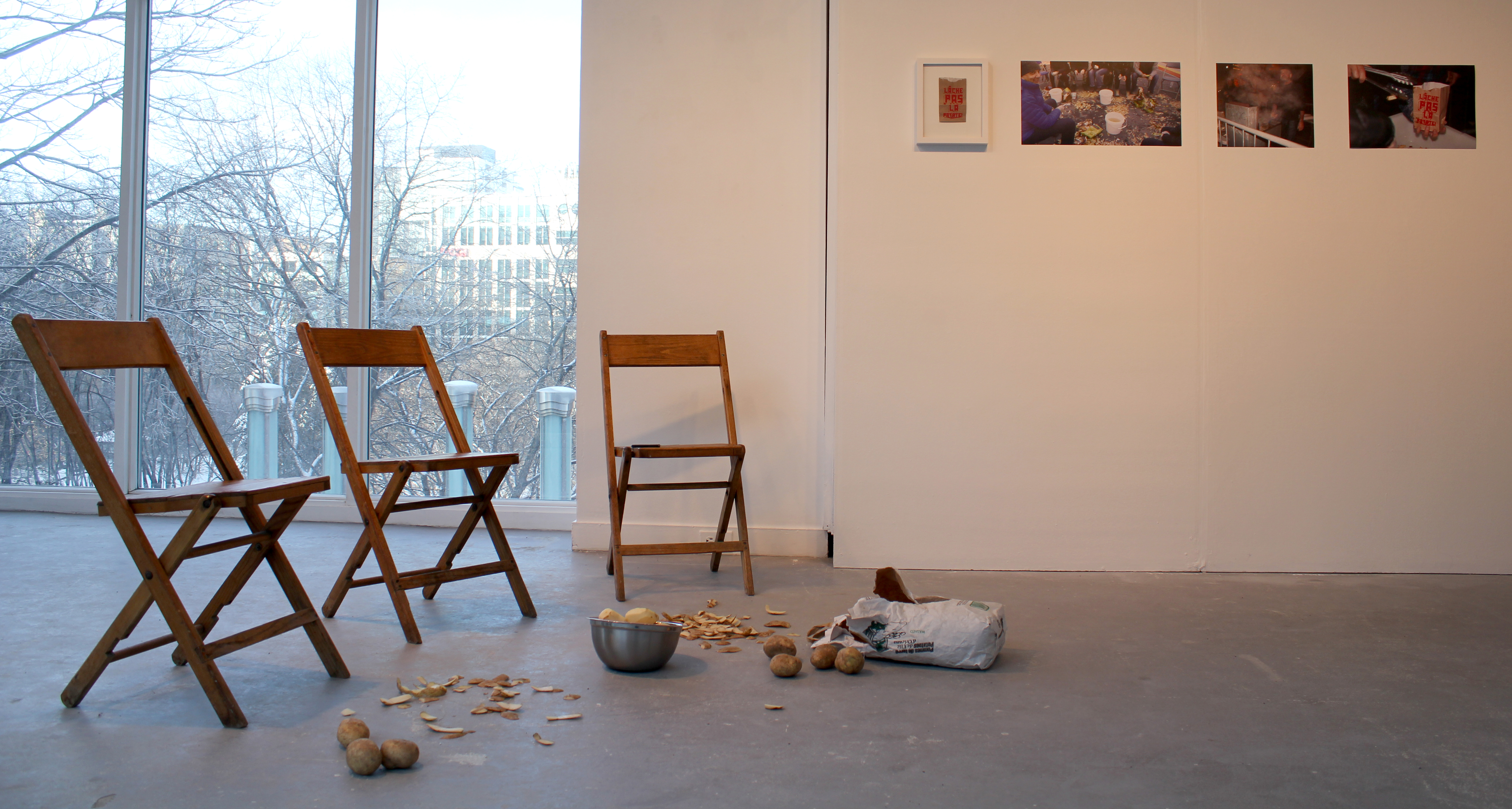 Ci-haut, reconstitution en galerie (Engramme) de la performance Lâche pas la patate à des fins de documentation.