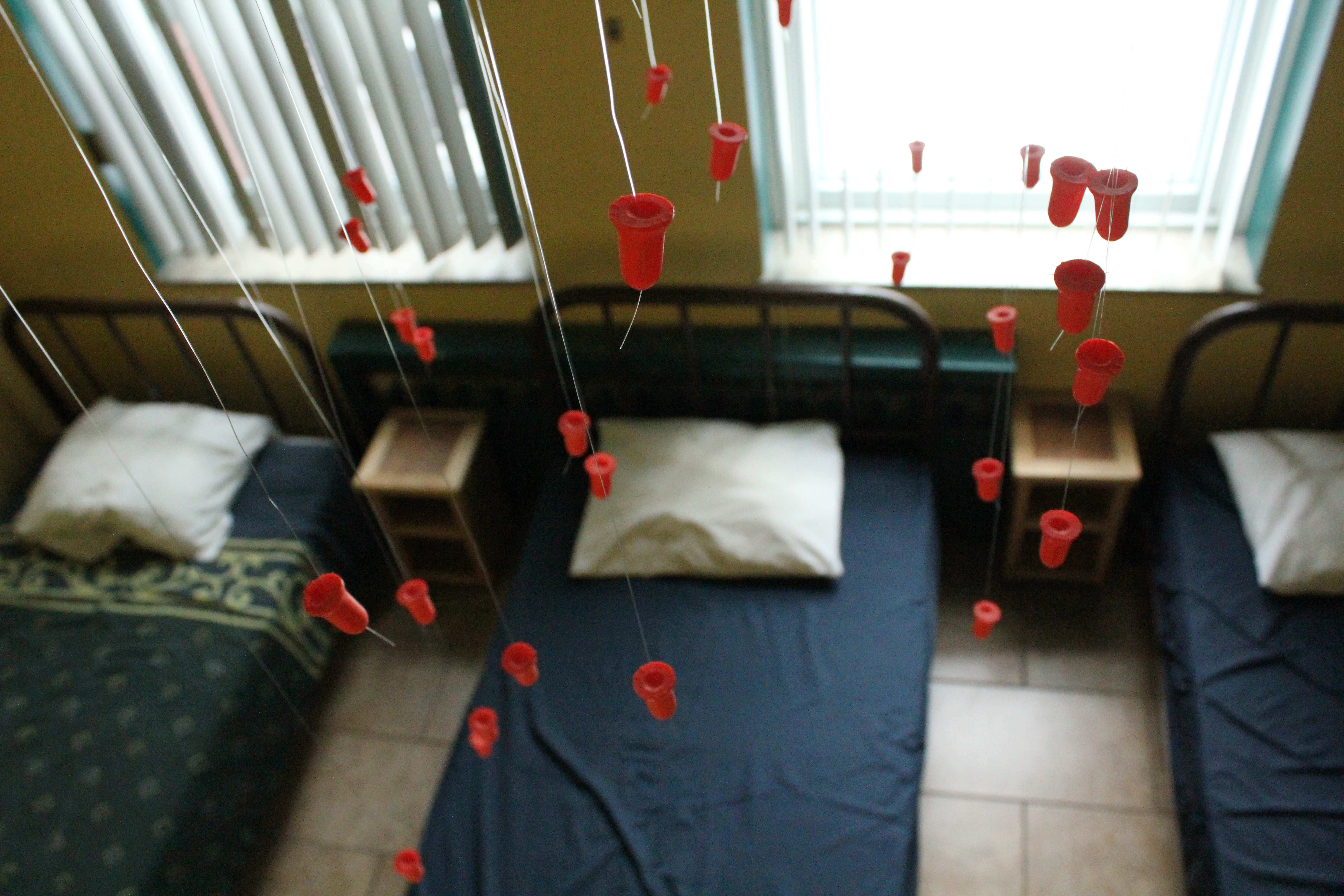 LA CHAMBRE DES RONFLEURS est un mobile présentant une pluie de bouchons d’oreilles contextualisé dans la chambre des ronfleurs de la Maison Revivre. L’œuvre est ensuite documentée en galerie.