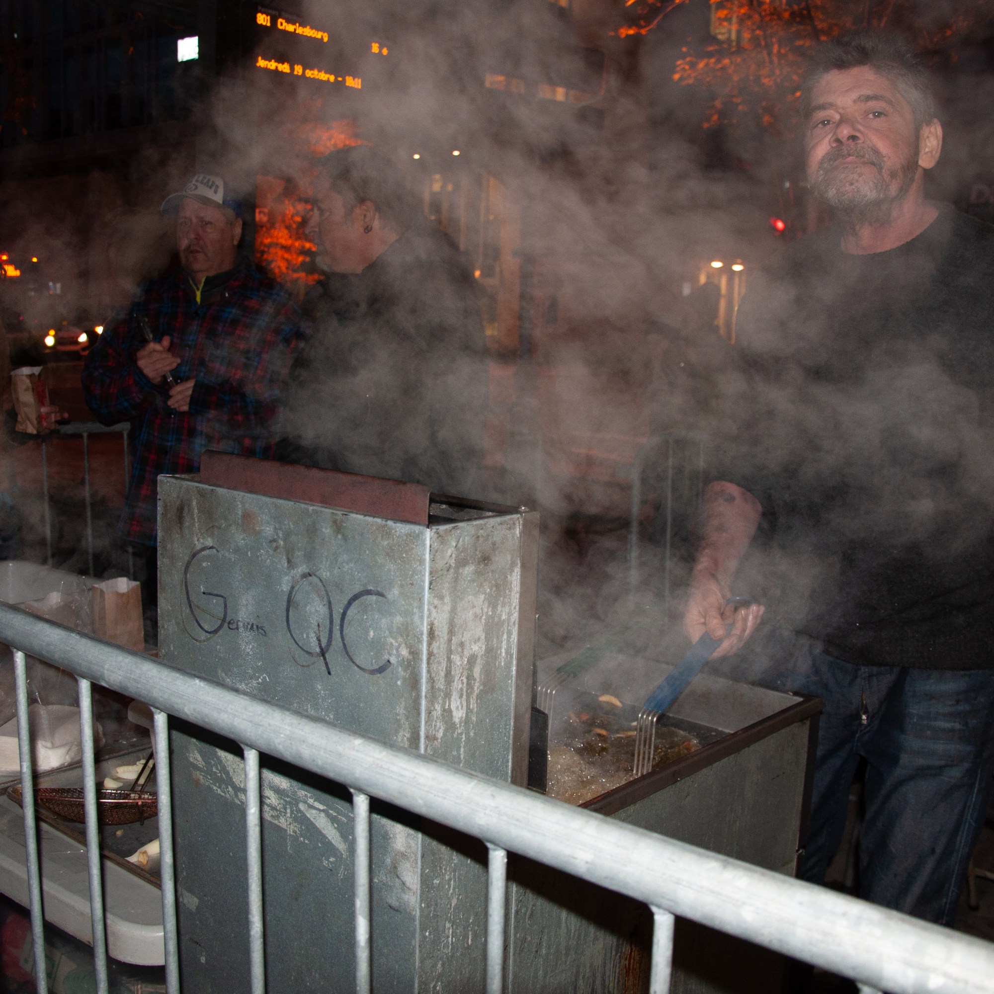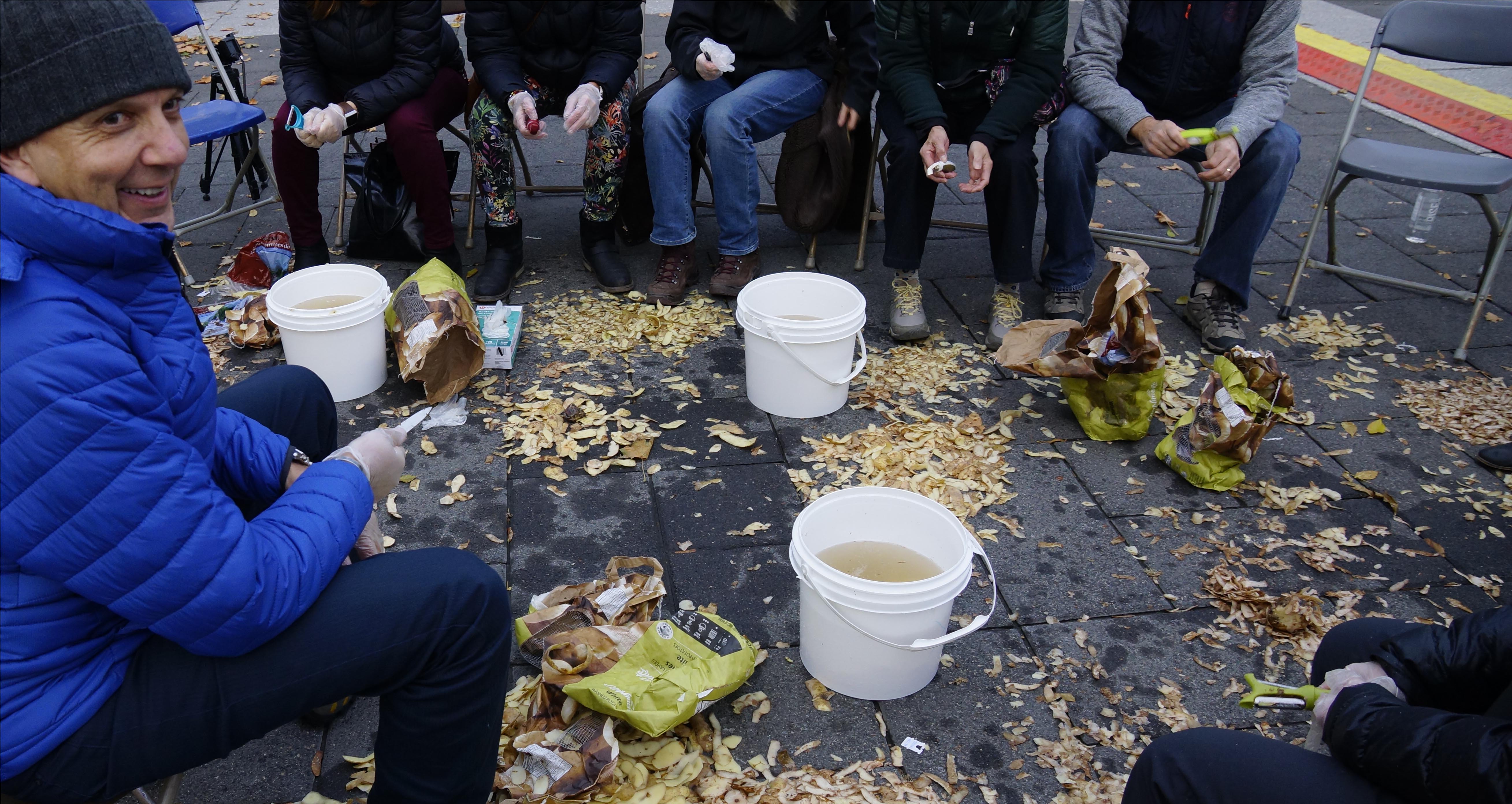 L’artiste organise une épluchette de patates sur la place publique avec la complicité des hommes de Revivre dans le cadre de la Nuit des sans-abri (NSA) 2018. Durant la performance, les hommes de la Maison Revivre interpellent les passants pour partager une action collective.