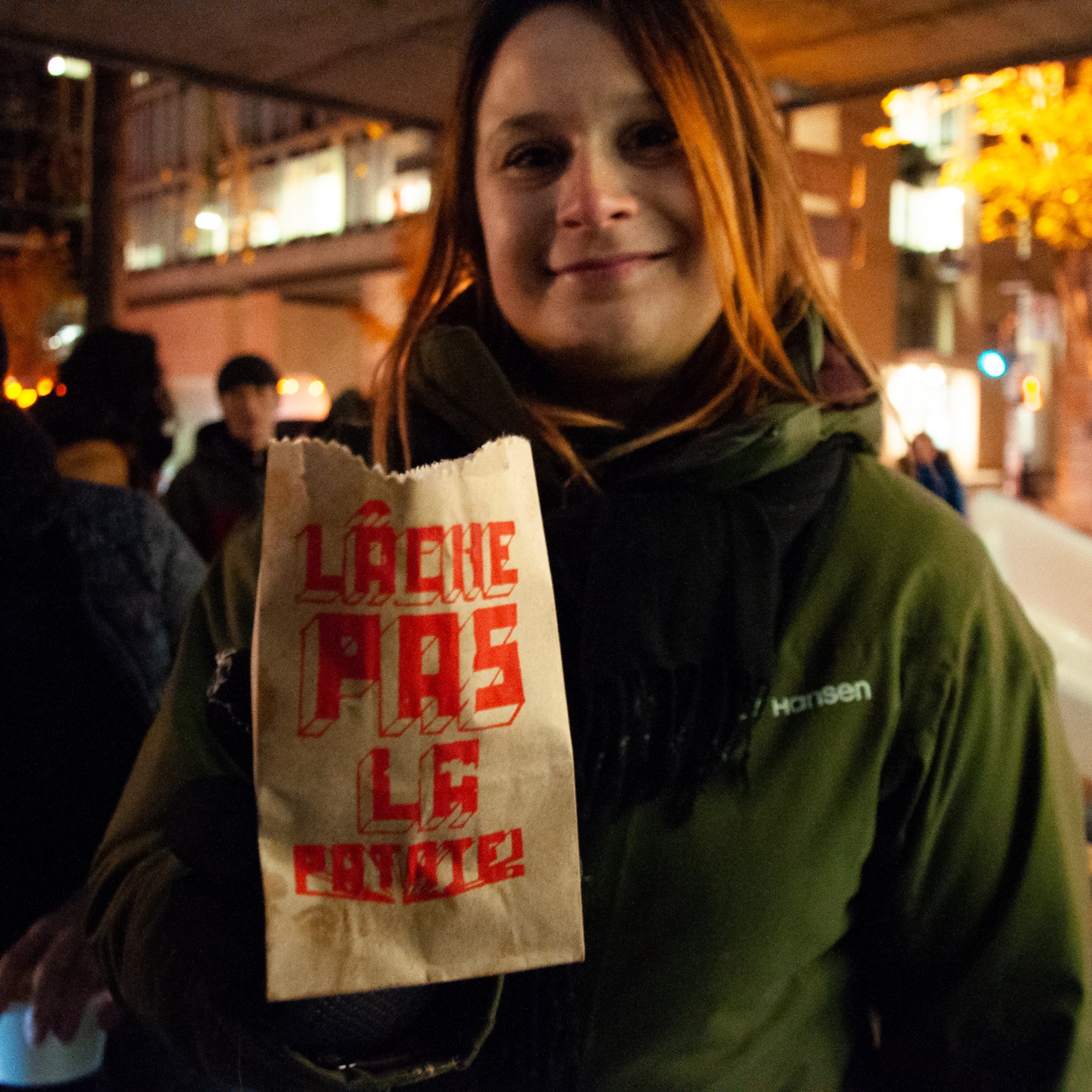 La soirée se poursuit en un happening festif ayant pour titre Lâche pas la patate. Les patates épluchées sont transformées en frites par les hommes de Revivre puis distribuées au passants de la NSA dans des sacs sérigraphiés à l’effigie du slogan.