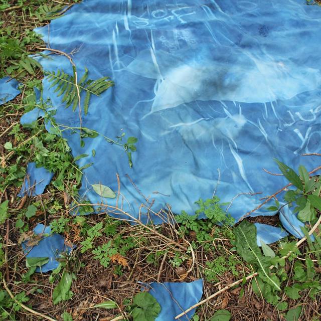 TAKING OFF/PUTTING ON est une installation processuelle faisant état du processus de recherche de l’artiste en résidence autour du déshabillage et de la technique du cyanotype.